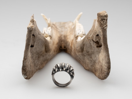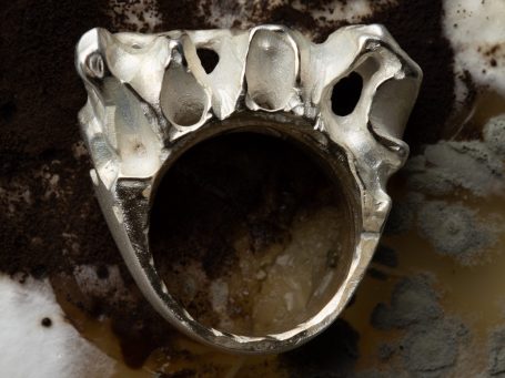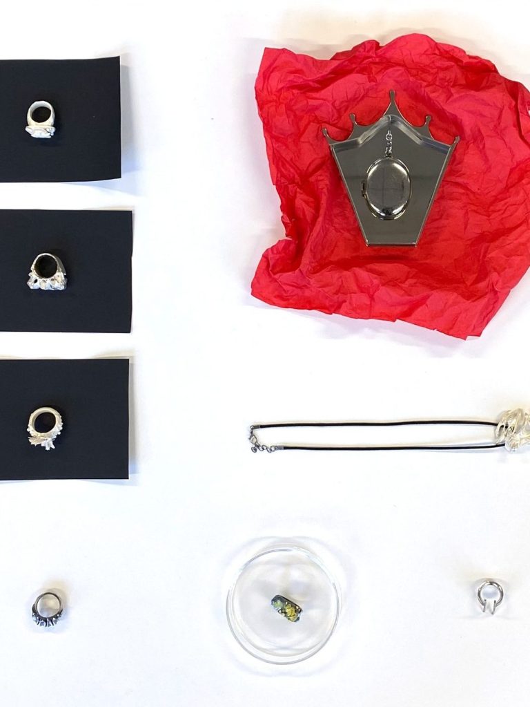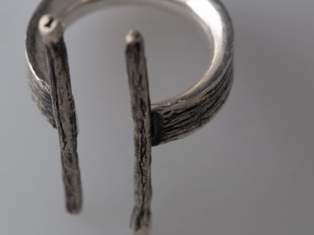 Meine ersten Metallarbeiten entstanden im Winter 23/24 im Grundlagenkurs Metallgestaltung. Ich lernte verschiedene Techniken und setzte sie in unterschiedliche Ringmodelle sowie eine Brosche um, unteranderem additive und subtraktive Verfahren und Arbeiten ausschließlich durch Schmieden. Dabei entstand auch ein Objekt, das komplett über Steckverbindungen konstruiert wurde. Großen Fokus habe ich am Ende darauf gelegt die Ergebnisse so zu präsentieren, dass Konzept und Details verständlich eingefangen werden.