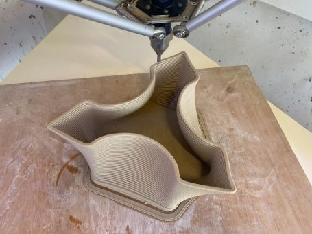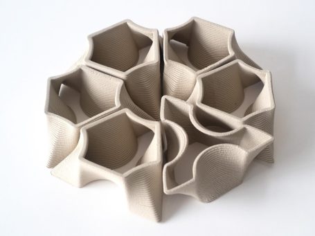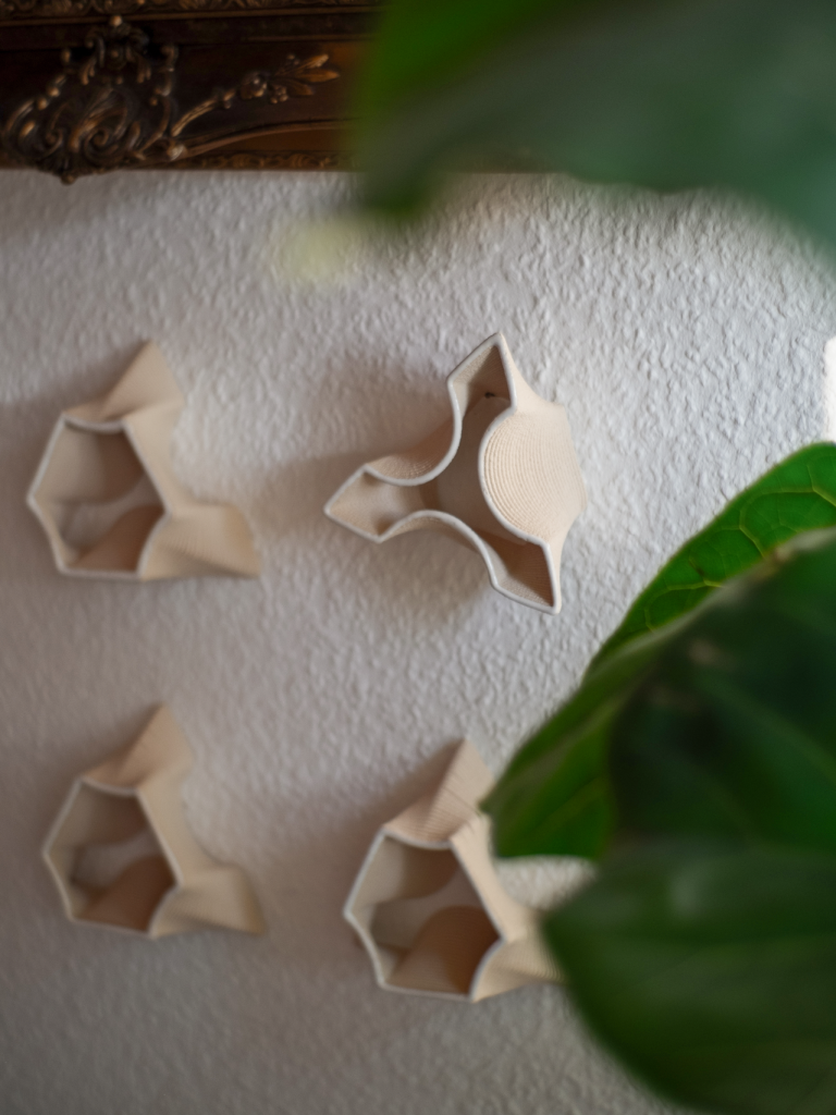 Ich wollte die Technik des Ton-3D-Drucks lernen und habe mich dabei von den auffälligen Fliesenmustern inspirieren lassen, die ich in Portugal fotografiert habe. Auch die Arbeiten von Piotr Wasniowski haben mich beeinflusst. Die entstandene Form lässt sich deswegen unendlich wiederholen, sodass aus Lücken und Vertiefungen spannende neue Muster entstehen. Durch die dreieckige Form ergeben sich verschiedene Ausrichtungen und die Objekte lassen sich flexibel anordnen, sei es als kleine Installation oder um ganze Wände zu gestalten.