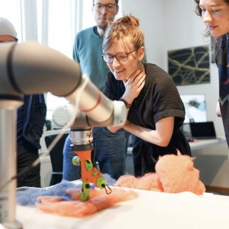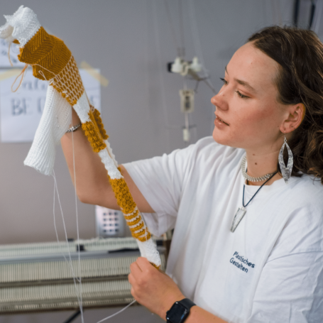 Für die Auseinandersetzung mit Textilien und Technologie hatte ich die Gelegenheit in verschiedenen Workshops, zu experimentieren und Techniken wie Filzen, Tuften und das Arbeiten an der Strickmaschine zu lernen. Dabei habe ich viel über Materialien und ihre Eigenschaften in Kombination mit Technik erfahren und den Umgang mit dem Roboterarm vertieft. Vor allem mitgenommen habe ich die Erfahrungen die durch den forschenden Ansatz dieses Kurses entstanden: wie man dranbleibt, Neues ausprobiert und Prozesse sinnvoll dokumentiert.
