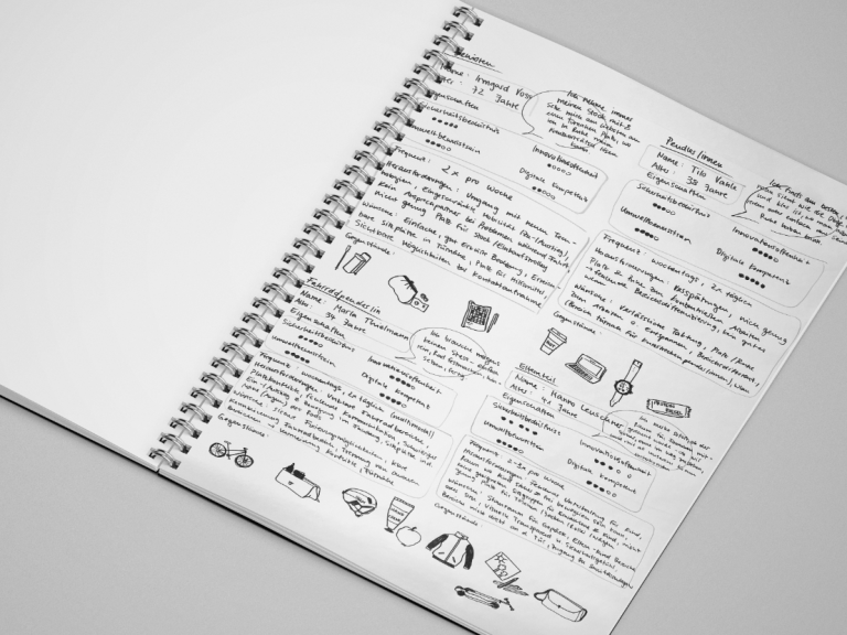 Im Entwurfsprozess habe ich verschiedene Methoden eingesetzt, um Ideen zu entwickeln, Nutzende besser zu verstehen und mein Konzept zu konkretisieren. Gezeigt wird hier eine Auswahl, weitere Methoden wie Designbriefings, Zielgruppenanalyse oder Beobachtungen kamen auch zum Einsatz.